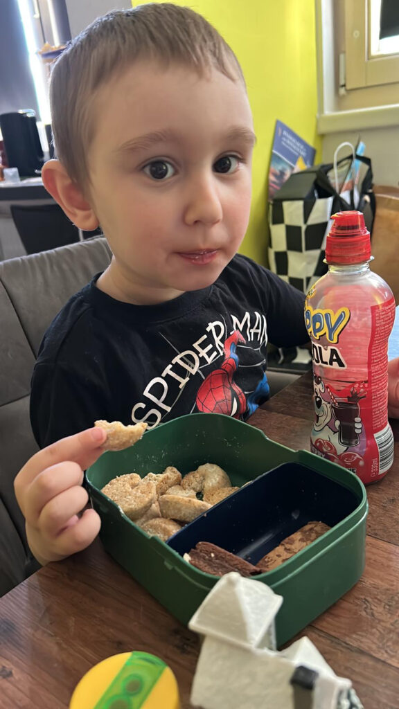 Im Kindergarten bekommt Marvin seine Jausenbox mit – gefüllt mit Schokokuchen und Vanillekipferl. Er isst sie dort gemeinsam mit den anderen Kindern am Tisch. Manchmal zeigt er Interesse am Kindergartenessen – neulich hat er sogar ein bisschen Lasagne probiert!